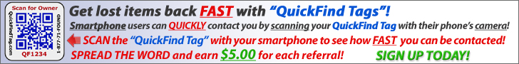 Lost and Found Services, connects businesses that have lost and found departments, to the "Owner Contact Service" Affiliate Program. Businesses can now earn recurring affiliate commissions by promoting the service to their customers. The Owner Contact Service, uses special Coded tags, to search for the owner of a lost item either online or by calling our Toll Free line for Live Operator Assistance. Using our "Quick Search" system, items can quickly and easily be returned to their rightful owners. Below is the sample counter-top/rack card and various banners for promoting the service to local and online patrons. For further details and to sign up your lost and found department, click here |